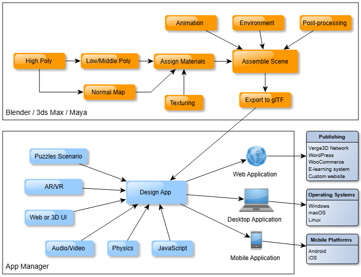 Para crear contenido web 3D interactivo, puede usar Blender, 3ds Max o la versión Maya de Verge3D con el mismo éxito. En la tabla a continuación, puede ver las etapas principales de la creación de una aplicación Verge3D típica. Prácticamente todo el trabajo puede ser realizado por una sola persona con conocimientos básicos de 3D.
