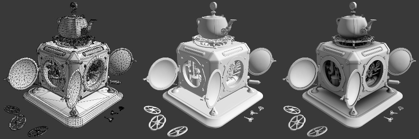En nuestro equipo, practicamos el siguiente proceso de modelado. Primero, se crean versiones de los modelos con alta poligonización. En la siguiente etapa, se obtienen modelos con poligonización baja o media simplemente eliminando el modificador de subsurf o la retopología. Se recomienda un máximo de 100 000 tris por modelo.